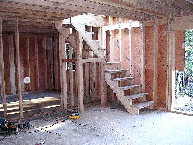 The stairway framing and bedroom and bath behind. Mike reversed the floor plan from the standard plan layout. Note that he has carried the loft floor all the way over the great room and kitchen. This area can also be left open and cathedral.