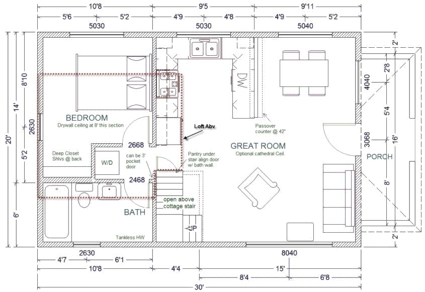This simple to build classic cottage has between 950 sq. ft. to 875 sq. ft. of living area counting the full sized loft and the 20'x 30' main floor (you have options about the size of the loft). Since all floors and roof bear on the outside walls, the interior of the floor plan can be redesigned to your liking. The framing system is simple and is designed for small crew construction so it can be built by owner-builders. This is one of our most popular plans. The 6-page materials list includes all materials for the post & pier foundation, all framing, hardware, insulation, windows and doors, drywall, electrical, plumbing and interior trim. This list is in Word DOC format (and PDF) so it can be modified and updated as the project progresses.