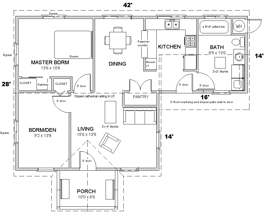This classic 952 sq. ft. cottage has two bedrooms and one bath. It is laid out for easy access with 3' doors and a ramp to the outside door on the right. The sunny porch makes a great sitting spot. The house can be built on a slab or crawlspace foundation (both are included). The roof is trussed with a sloped cathedral section over the Living Room. Two skylights fit between the trusses and bring in extra light to the center of the house. All interior walls are non-load bearing so the interior can be redesigned as needed.