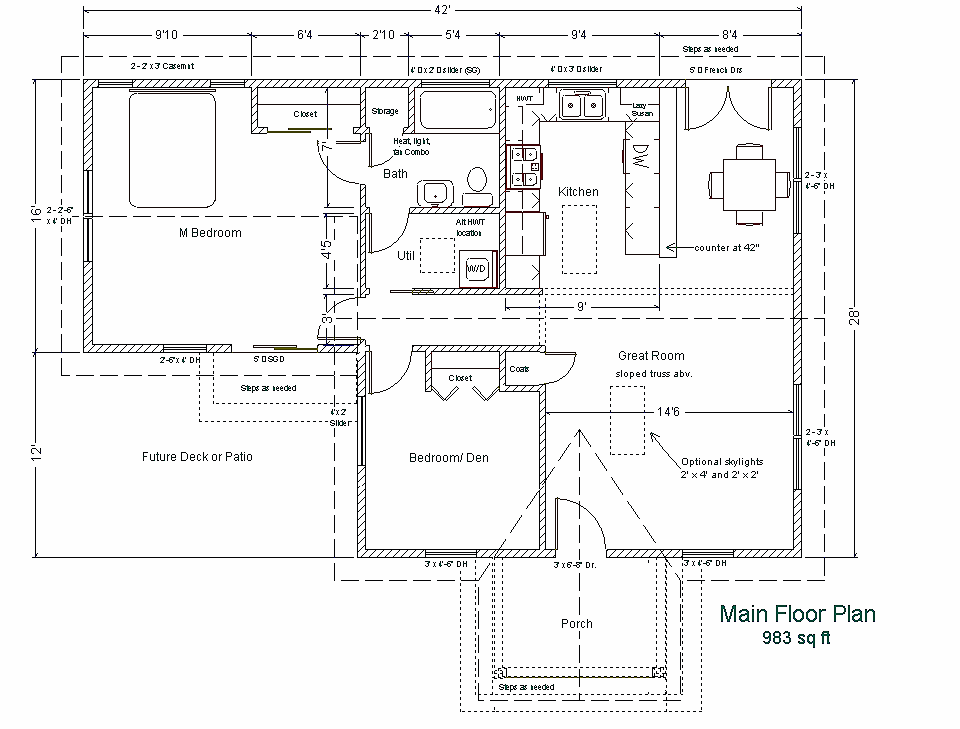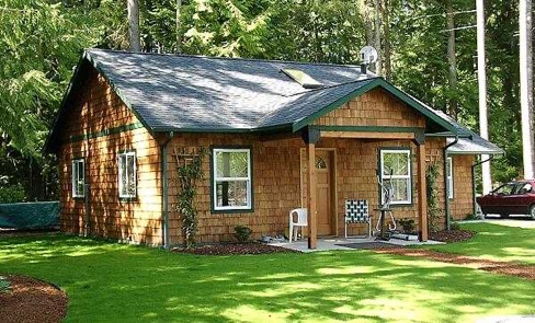 The Volks Cottage is an alternative floor plan for the Grandfather Cottage. Slightly larger, but still under 1000 sf. this easy to build Cottage House can be built on either a slab or crawlspace foundation (both foundation plans are included). The roof is trussed with a sloped cathedral section over the Living Room. Optional skylights fit between the trusses and bring in extra light to the center of the house.